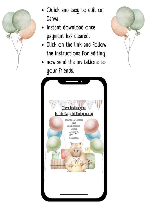 Make party planning beautifully easy with our fully editable Loubbie-Lou invitations. Designed for busy mums and families, these gorgeous Capybara invites can be customised in minutes-no design skills needed, no waiting for shipping. Just edit, download, and print or send digitally!