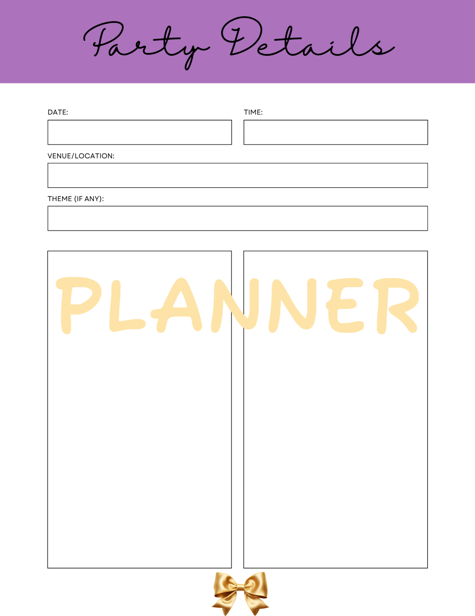 This isn't just another planner-it's your personal party assistant. Once you personalise your copy from the link provided, every page becomes uniquely yours - filled with spaces for names, themes, budgets, and checklists tailored to your celebration. With 13 beautifully crafted pages, this planner helps you stay organised, inspired, and stress-free as you plan the perfect party.